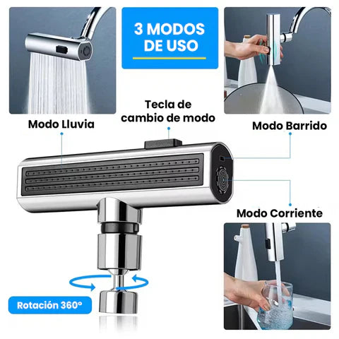 ☔ Modo Lluvia: Flujo uniforme y sin salpicaduras, perfecto para enjuagar platos con tranquilidad.