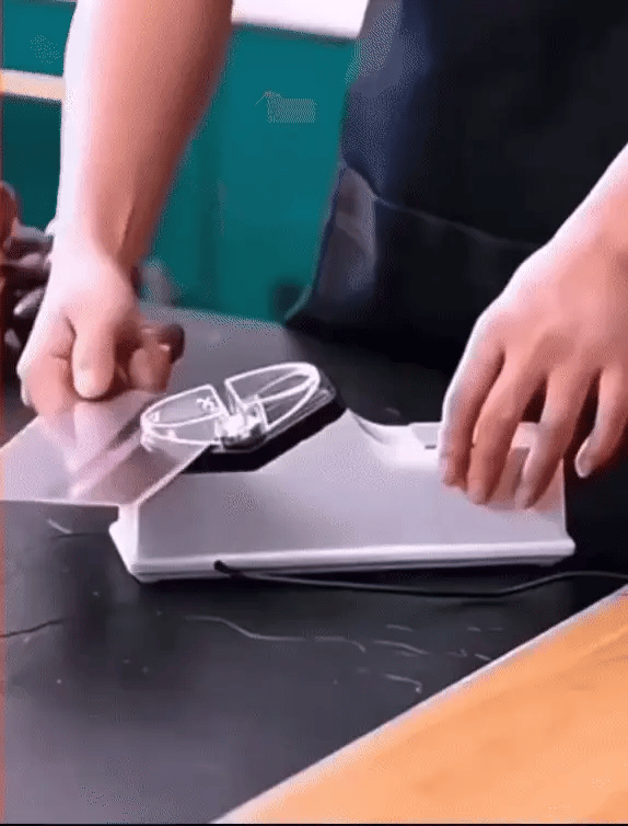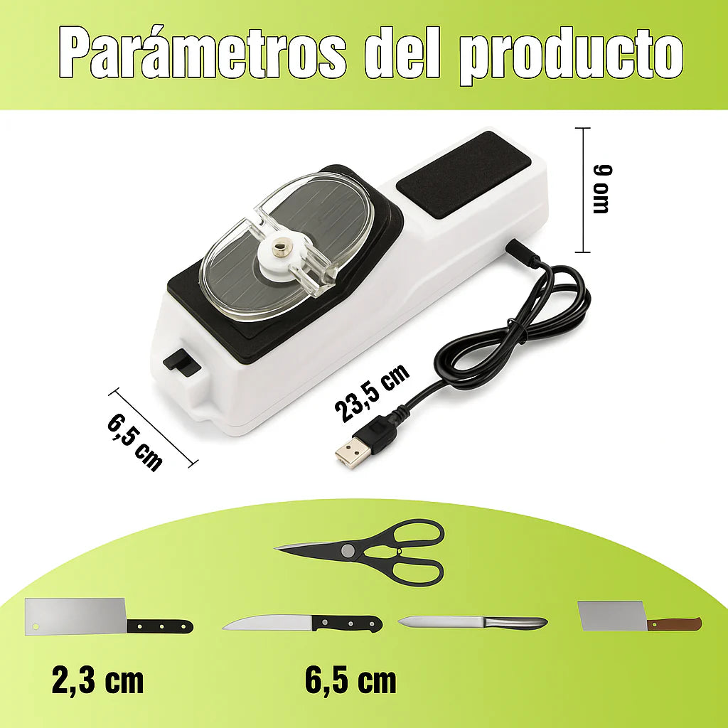 Solo conecta, pasa el cuchillo y listo. Ideal para acero, cerámica y tijeras