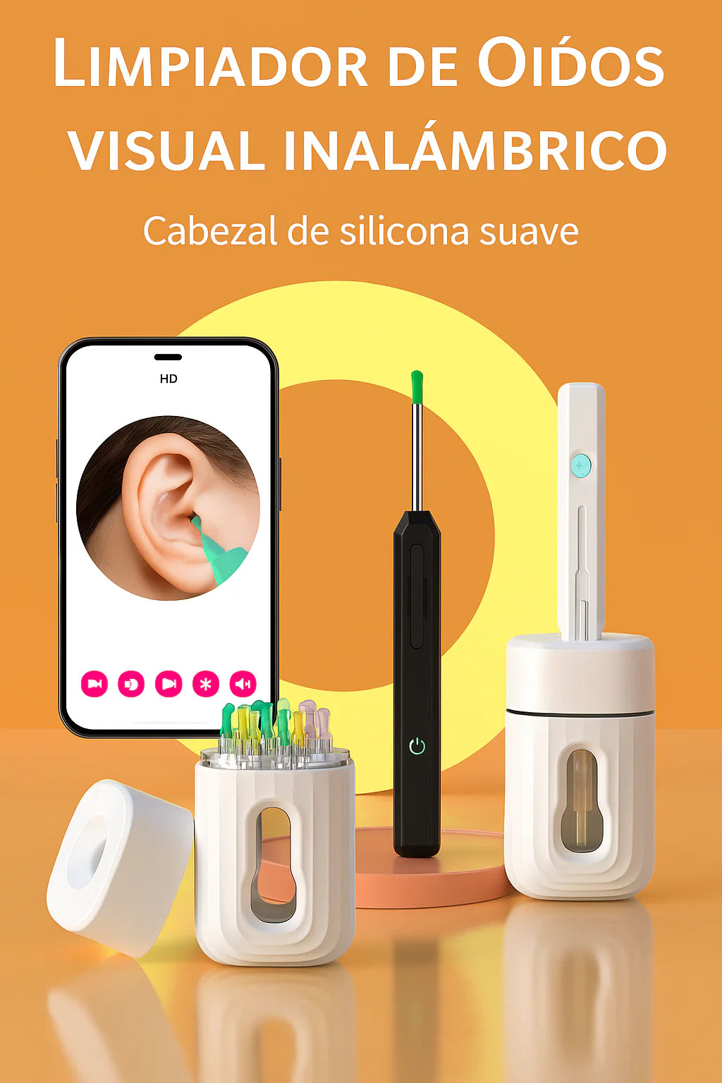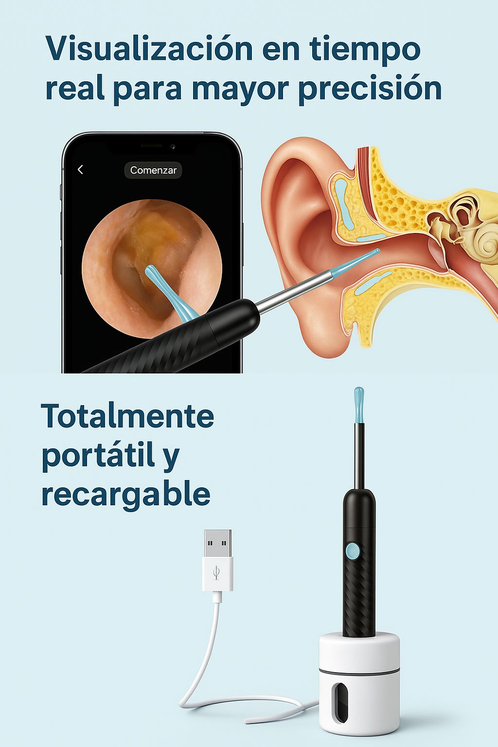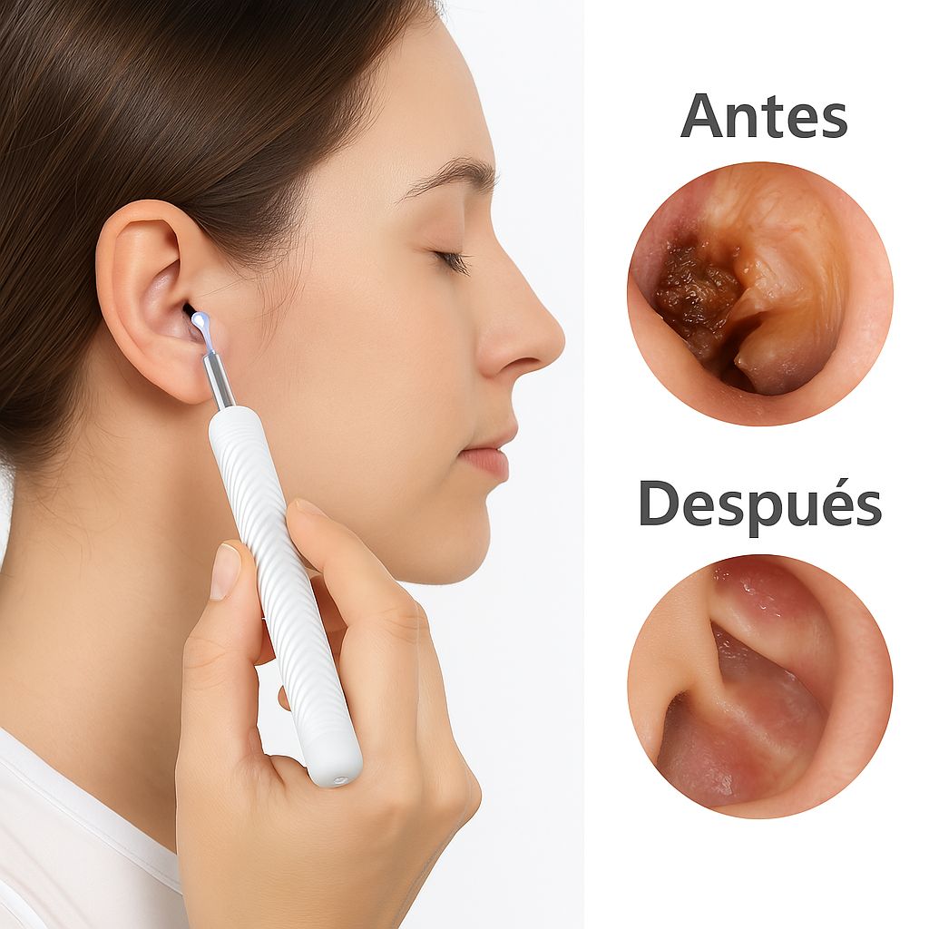 Nuestro innovador limpiador de oídos cuenta con una cámara HD integrada y conectividad WiFi para visualizar en tiempo real todo el proceso desde tu teléfono. Ideal para adultos y niños.